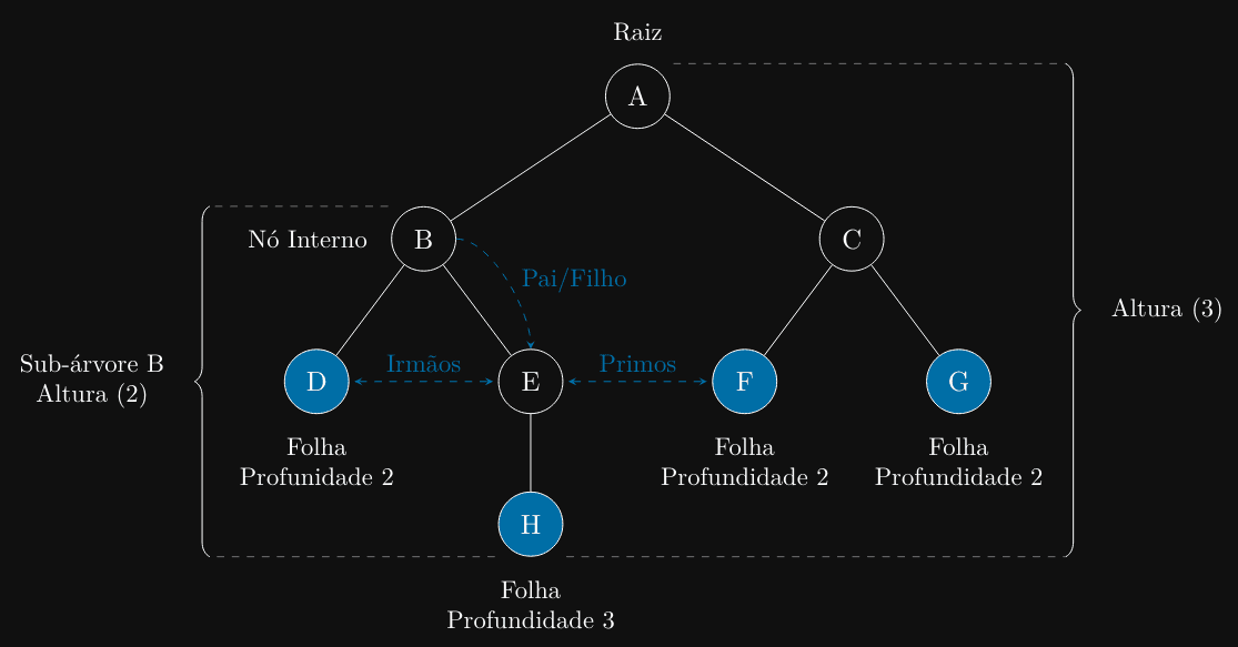 essencial (raiz, nó, folha, aresta, pai, filho, sub-árvore).
