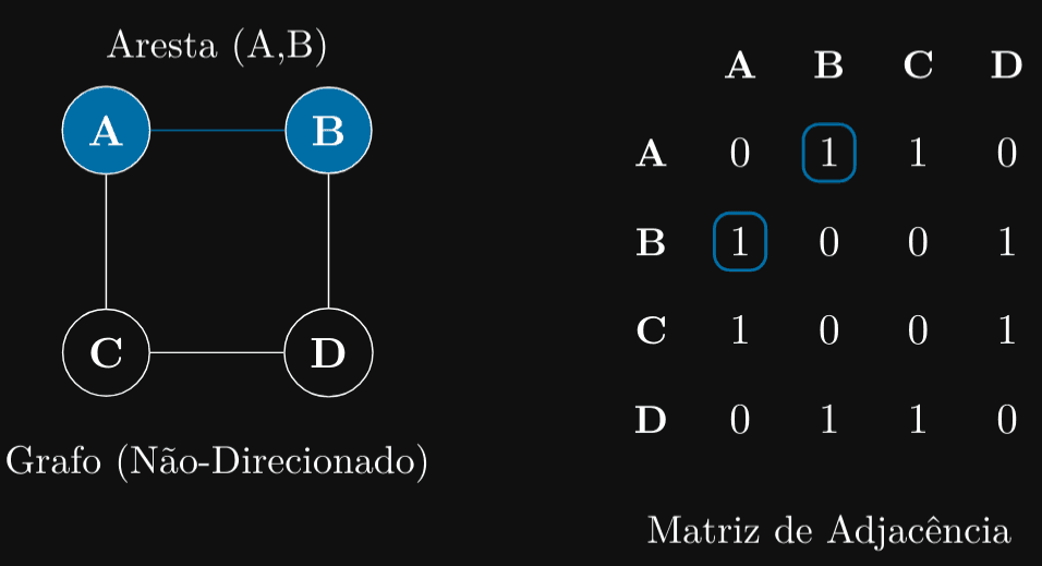 Usamos uma matriz (array 2D) NxN, onde N é o número de vértices. Se matrix[i][j] == 1, significa que existe uma aresta do vértice i para o vértice j. Se for 0, não há aresta. (Em grafos ponderados, matrix[i][j] armazena o peso da aresta).