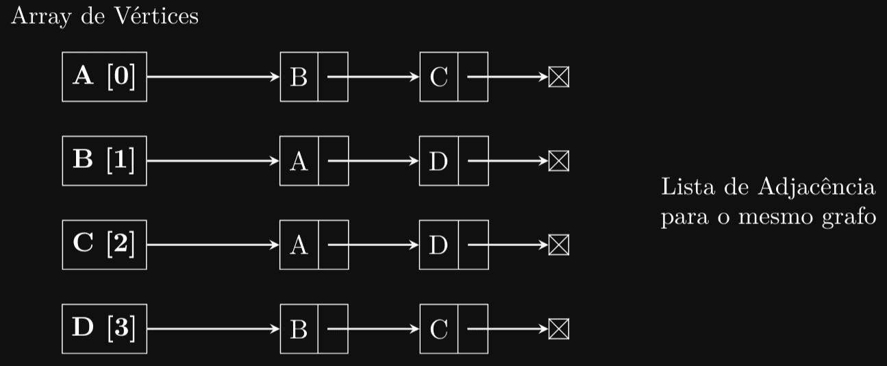 Usamos um array de listas encadeadas. O índice i do array aponta para uma lista encadeada contendo todos os vértices j para os quais existe uma aresta (i, j).