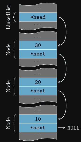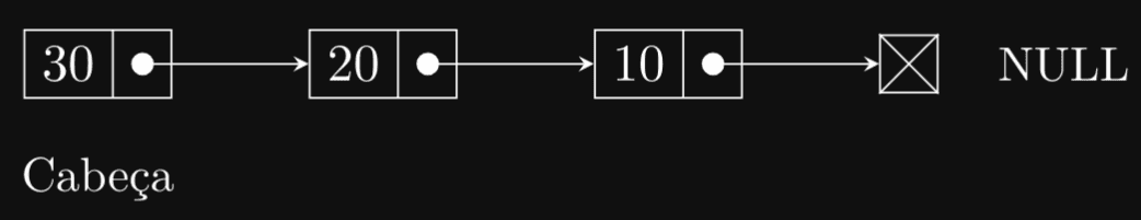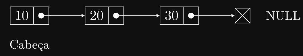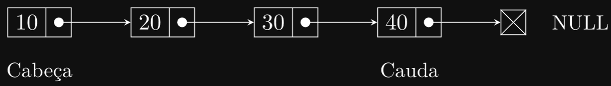 Neste exemplo, a lista encadeada começa com o nó 10, que aponta para o nó 20, que por sua vez aponta para o nó 30, e assim por diante. O último nó aponta para NULL, indicando o fim da lista. A cabeça (head) da lista aponta para o primeiro nó, opcionalmente também podemos manter um ponteiro para a cauda (tail) para facilitar a inserção no final da lista.