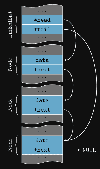 } LinkedList;A cauda (tail) da lista aponta para o último nó, permitindo inserções eficientes no final da lista.