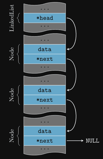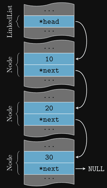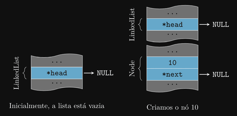 Perceba que os nós estão em partes diferentes da memória, mas o ponteiro next permite que eles sejam acessados sequencialmente.