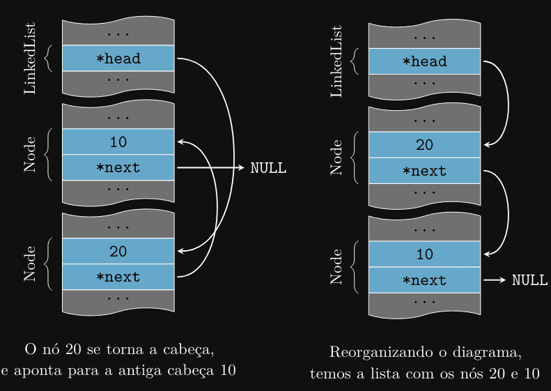 Perceba que a ordem dos elementos é inversa à ordem de inserção, pois inserimos os elementos no início da lista. Vamos ver passo a passo como essa operação é realizada, mas dessa vez do ponto de vista da memória: