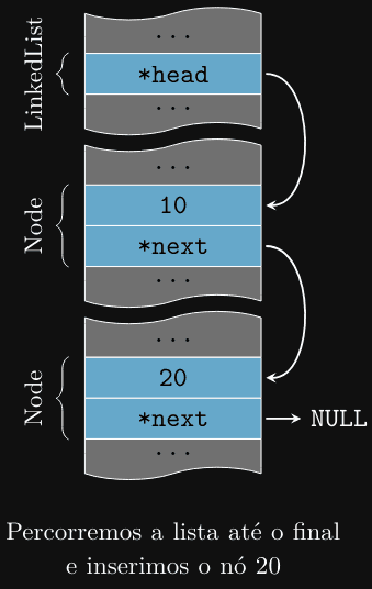 }Neste caso, percorremos a lista até o último nó (onde next é NULL) e inserimos o novo nó no final. Vamos ver um exemplo: