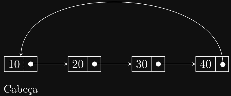Neste exemplo, o último nó (40) aponta de volta para o primeiro nó (10), formando um ciclo contínuo. Isso pode ser útil em situações onde a lista precisa ser percorrida repetidamente em um loop infinito.
