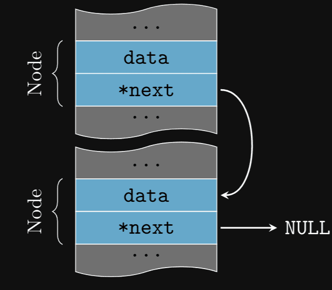 } Node;Nesta estrutura, data armazena o valor do nó e next é um ponteiro para o próximo nó na sequência. O tipo struct Node* é um ponteiro para uma estrutura Node, permitindo que cada nó aponte para o próximo nó na lista.