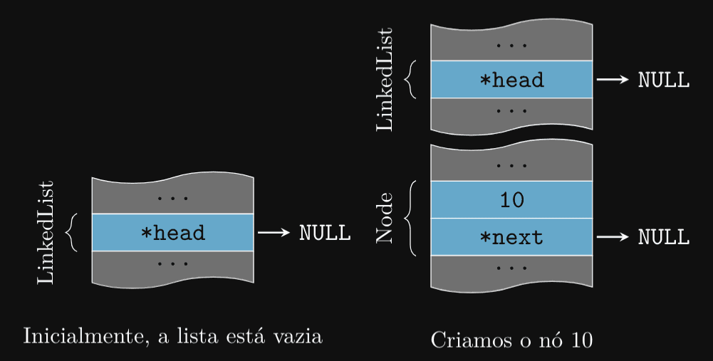 Na hora de criar uma lista encadeada, é importante inicializar a cabeça e a cauda com NULL para indicar que a lista está vazia, logo, podemos criar uma função para isso: