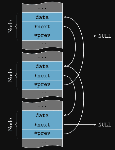 } Node;Neste caso, prev é um ponteiro para o nó anterior na sequência. Isso permite percorrer a lista em ambas as direções, facilitando a remoção de elementos.
