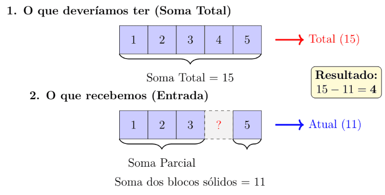 Solução O Conceito: Diferença de Somas Para resolver esse problema, usamos o conceito de Diferença de Somas. Imagine que você tem um quebra-cabeça de 5 peças (numeradas de 1 a 5). Se você somar o valor de todas as etiquetas dessas peças, você terá: