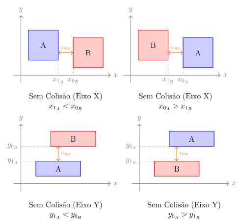 Imagine o Retângulo A e o Retângulo B. Eles não colidem apenas se uma das quatro condições abaixo for verdadeira: